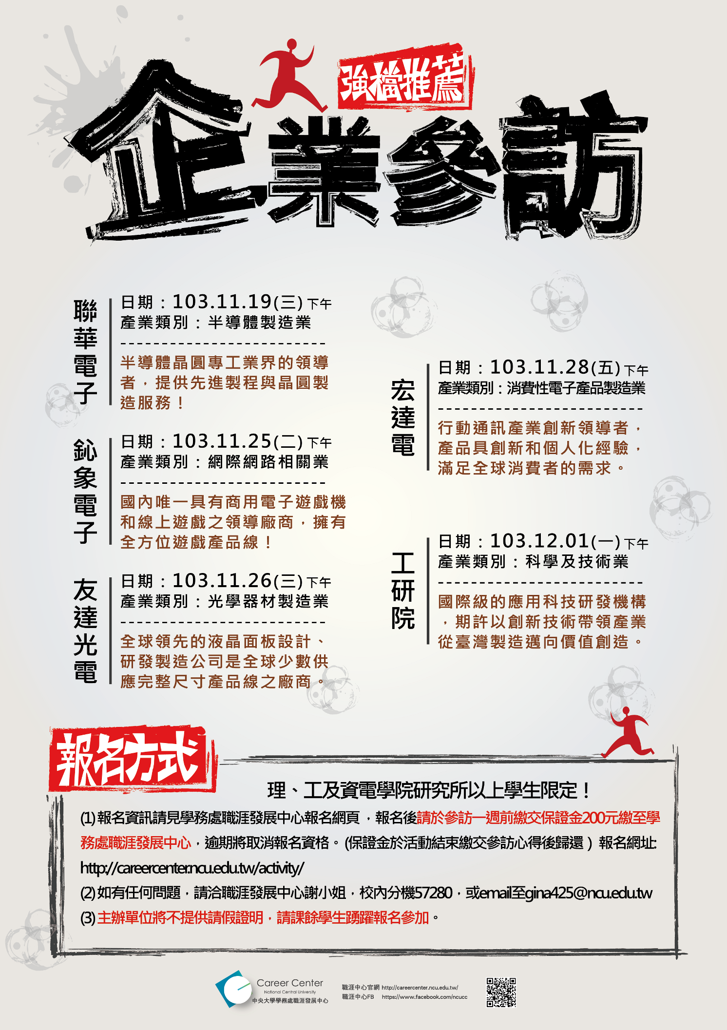 中央大學職涯發展中心將於11月起辦理5場企業參訪,提供同學與企業界職場生活及工作經驗之分享交流,與面對面雙向溝通的互動機會。請有興趣的大學部與研究生踴躍報名。 詳情請參閱活動海報 報名請上職涯發展中心活動報名系統