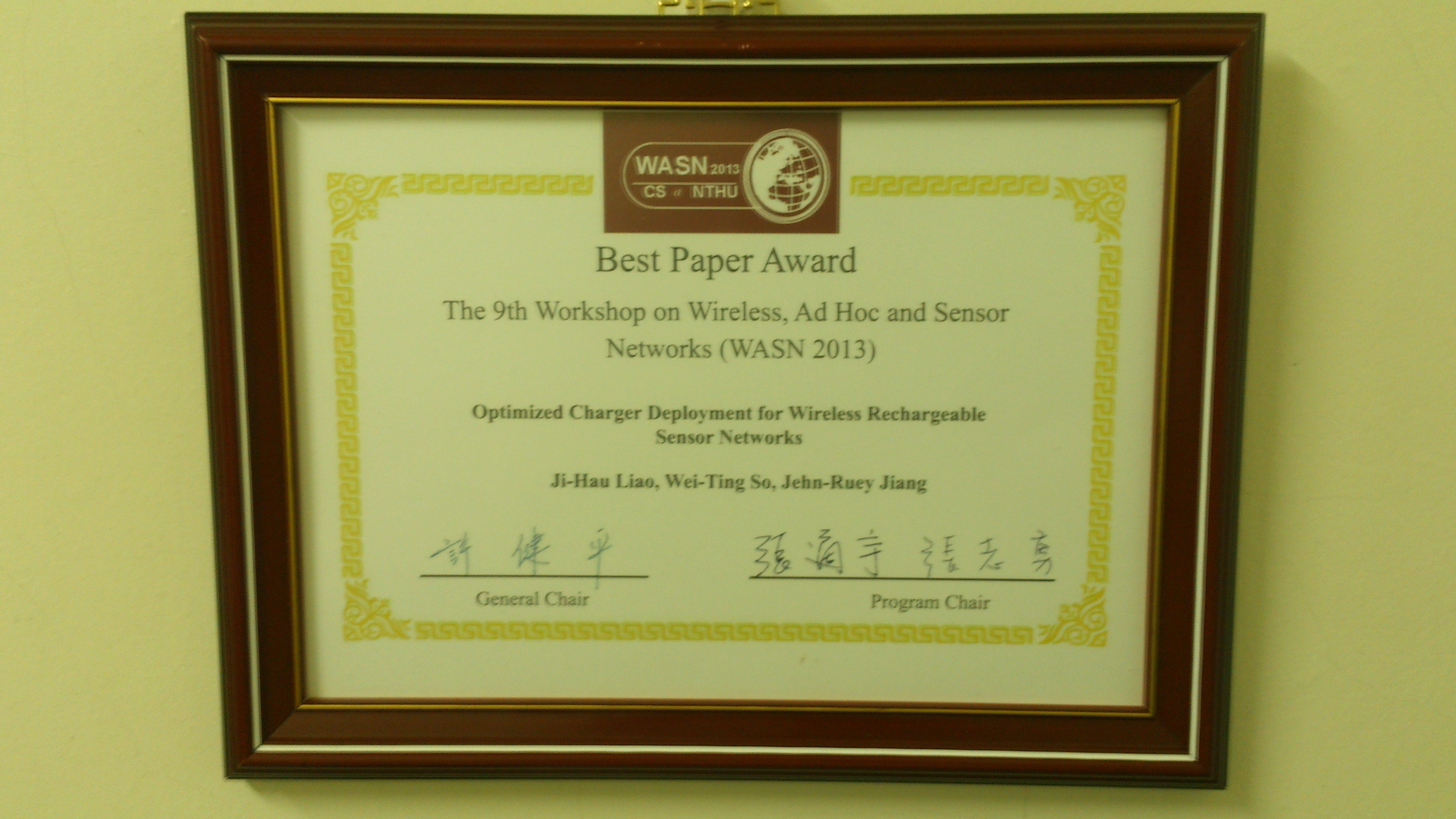 賀!江振瑞教授指導學生廖基豪、索維廷參加「The 9th Workshop on Wireless, Ad Hoc and Sensor Networks (WASN 2013)」獲得最佳論文獎。 2013-09-03wasnbestpaper.jpg