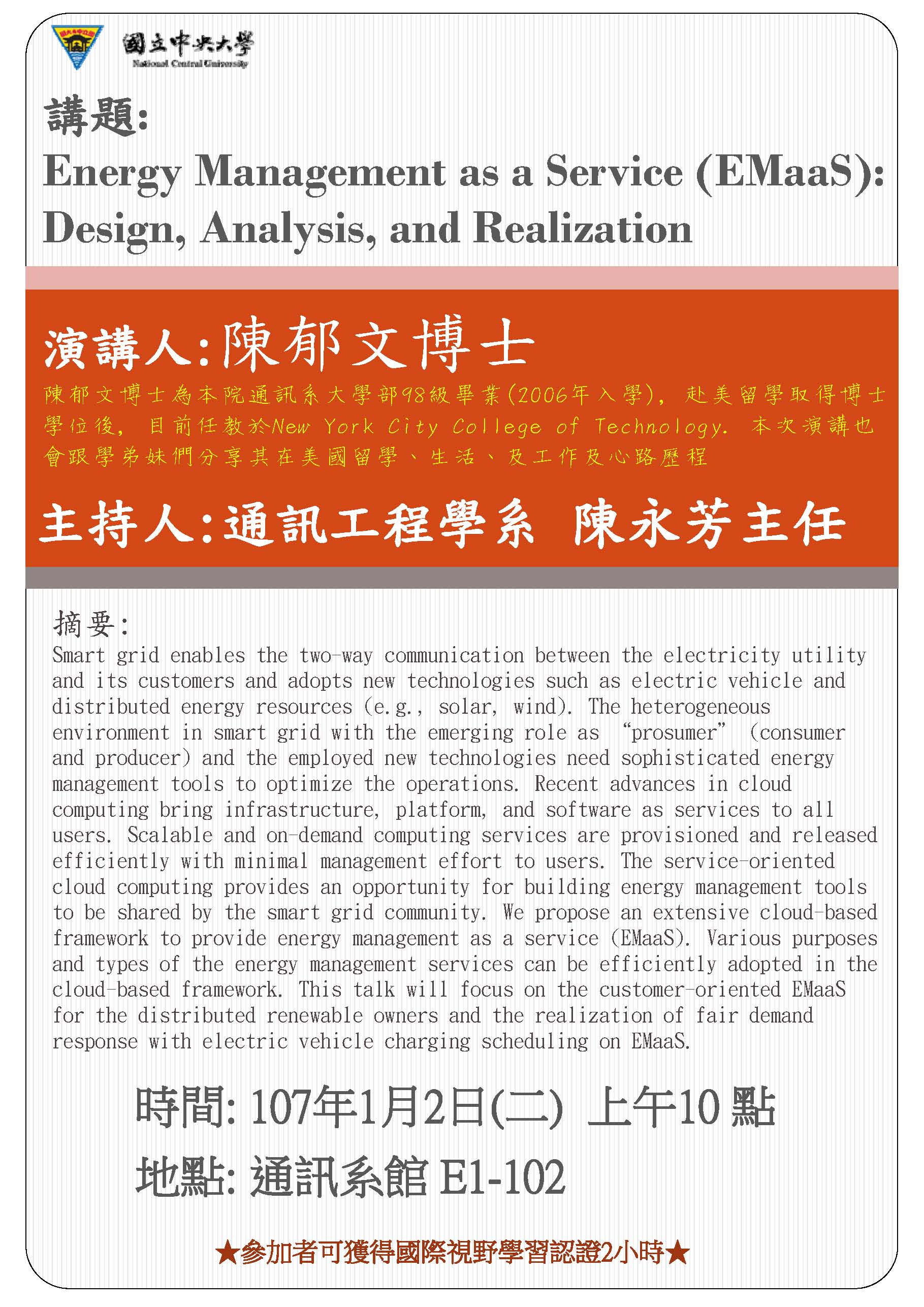 講題:Energy Management as a Service (EMaaS) :Design, Analysis, and Realization