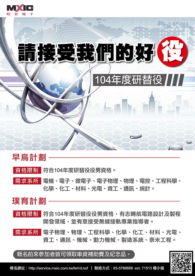 旺宏電子104年度研發替代役甄選活動(車資補助+面談),請參閱附檔,歡迎報名參加! 報名網址:http://service.mxic.com.tw/hr/rd.nsf/ 聯絡電話:03-5786688 ext. 71513 楊小姐 聯絡e-mail:hilaryyang@mxic.com.tw 104年度旺宏電子研替役甄選
