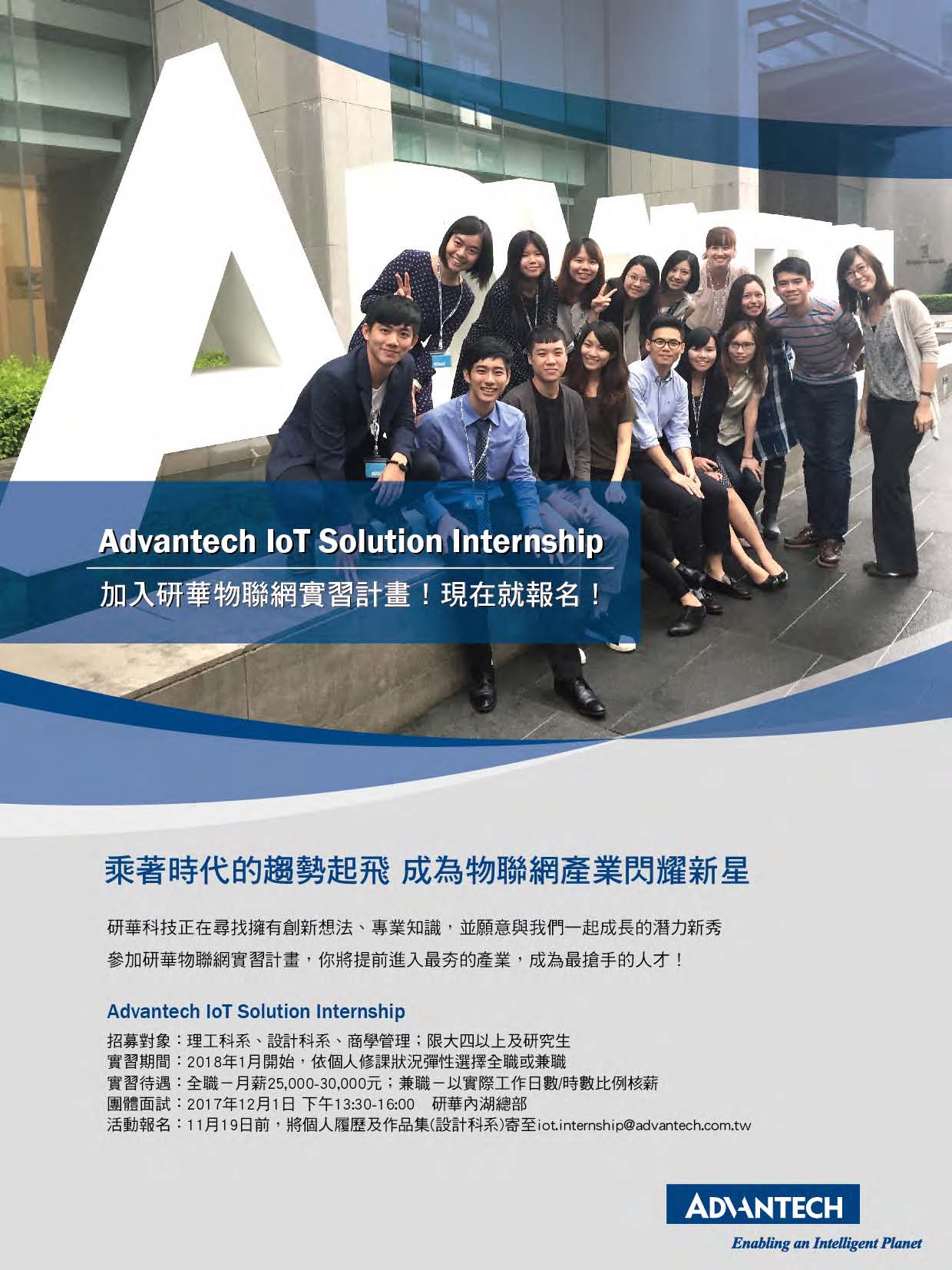 實習計畫報名至11月19日截止,請將個人履歷及作品集(設計科系)寄至iot.internship@advantech.com.tw,通過履歷審查的同學將參加團體面試(12月1日 下午13:30-16:00,研華內湖總部)。實習計畫說明及職缺如下: