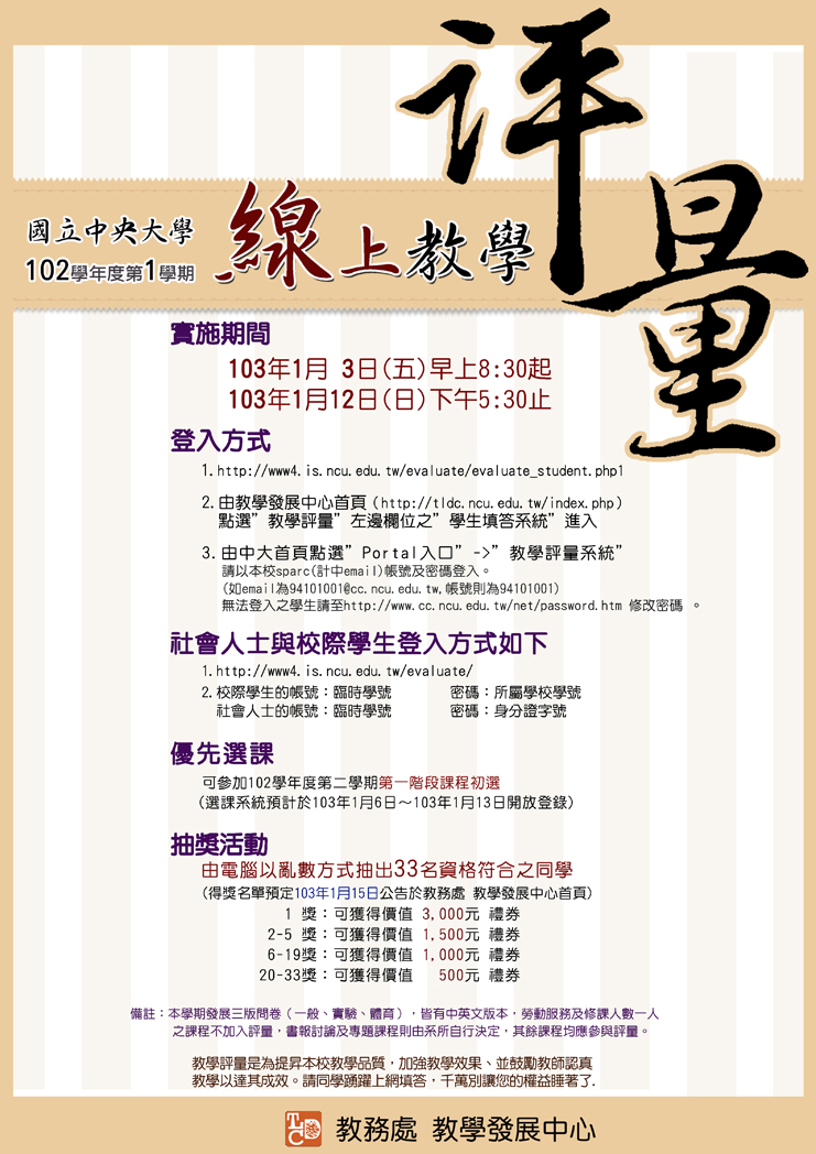 102學年度第一學期線上教學評量時間為1/3(五)八點半開啟 (截止日期為1/12(日)下午五點半),填完這學期的評量問卷 才可進入選課系統參加102學年度第二學期的課程初選 選課時間:1/6(一)~1/13(一),請大家踴躍填寫。 10201線上評量海報s.jpg