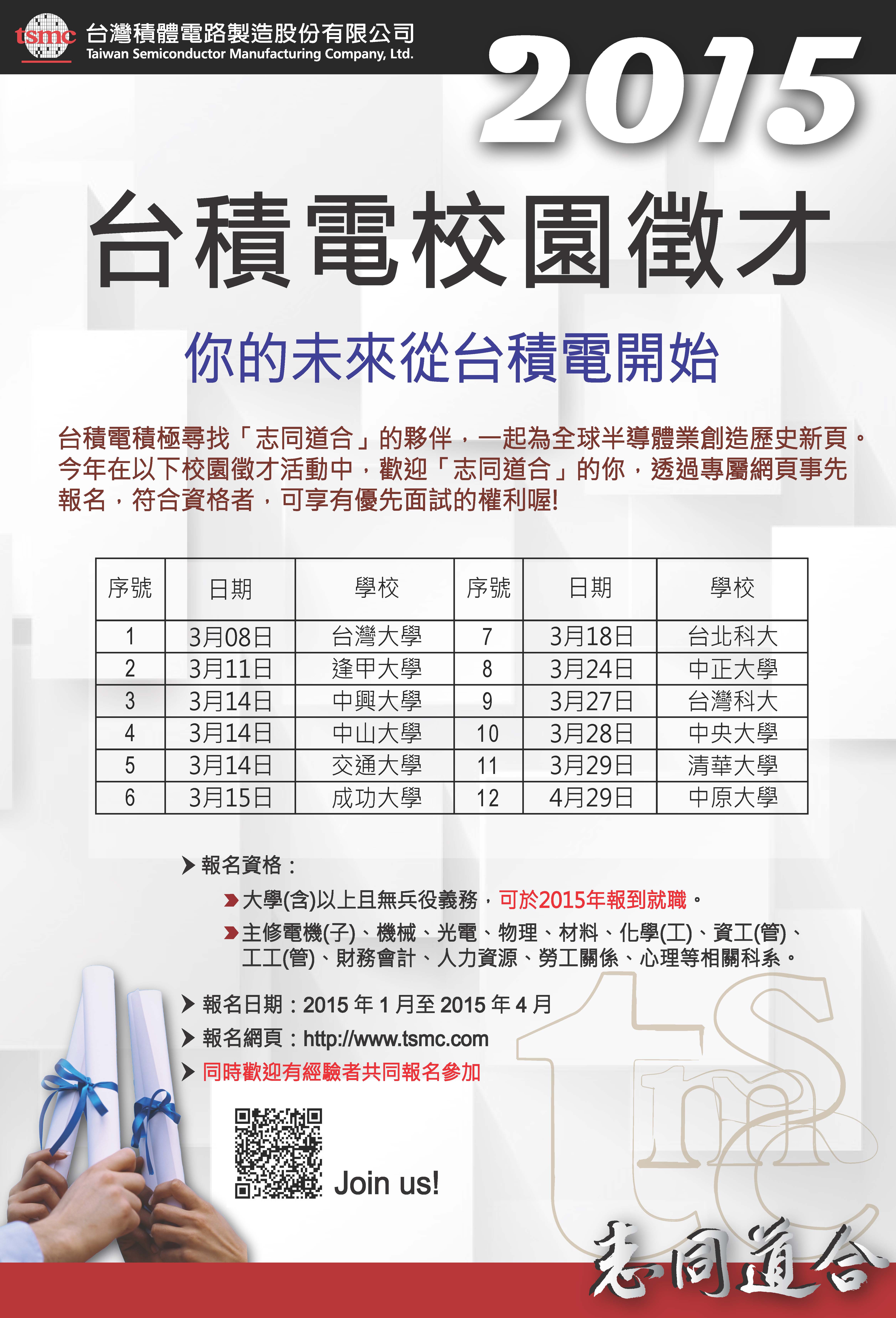 台積電2015年校園徵才暨面試會開放申請,邀請大學(含)以上且無兵役義務應屆畢業生,可於今年報到就職的同學,即日起至申請網站填寫履歷!